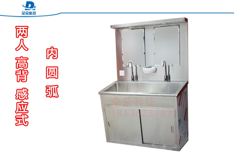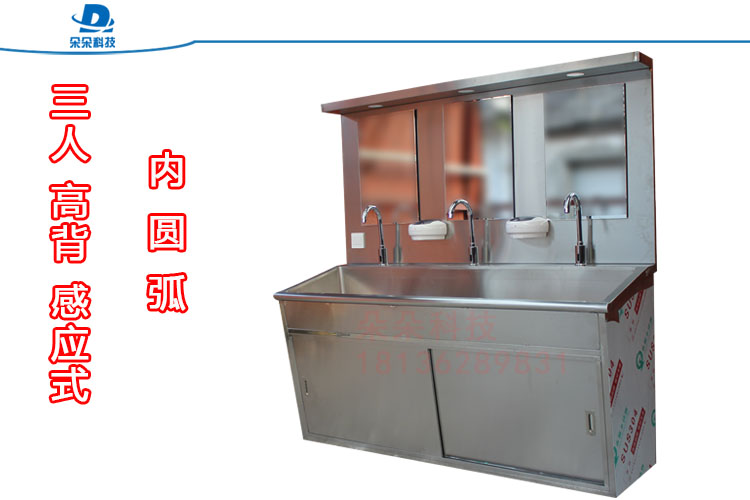 采用进口优质304不锈钢板制造,国际标准,静音防溅,圆弧结构,恒温出水,配备镜灯和感应皂液器,标准型号为1人、2人、3人洗手池,可定制非标各类洗手池。